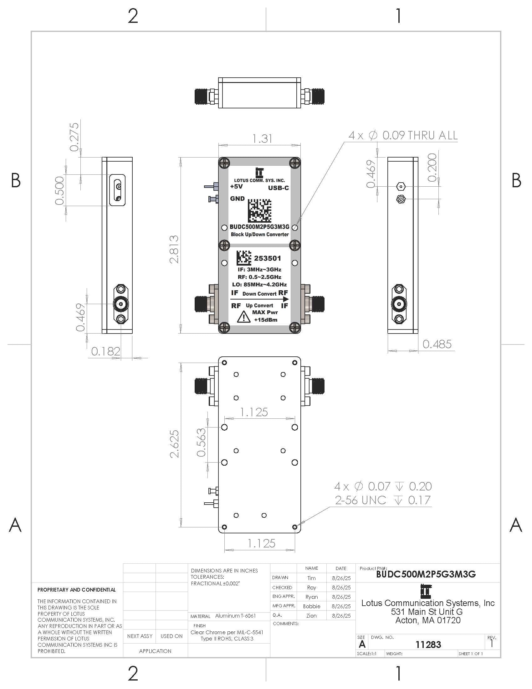 Part Number: BUDC500M2P5G3M3G is a 1 Channel 500M ~ 2.5GHz block up and down converter. IF frequency range is 3MHz to 3GHz. RF frequency range is 500MHz to 2.5GHz. An Integrated low phase noise LO supports tunable LO frequencies.