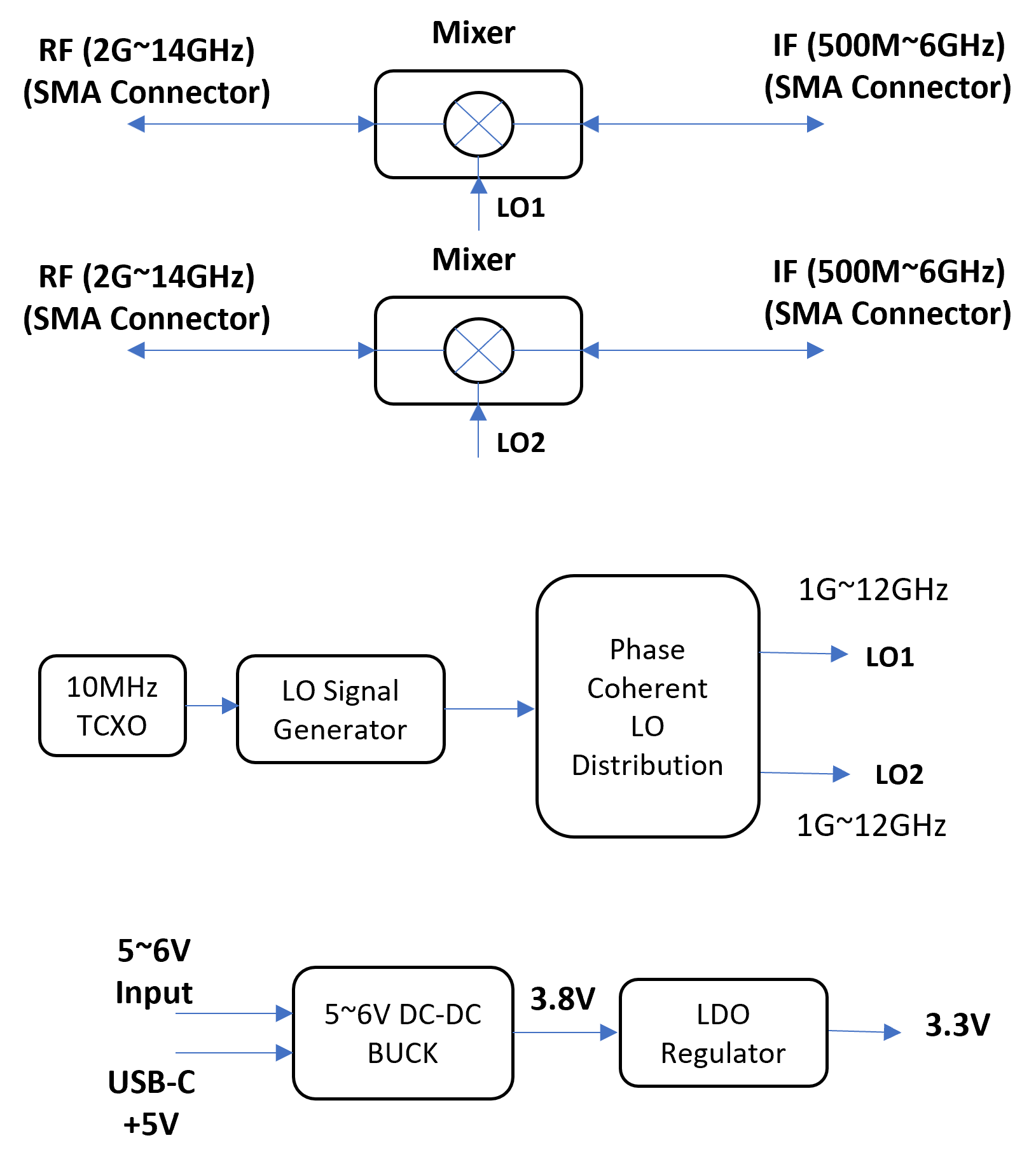 It has 8.0dB conversion loss at 5.8GHz with low LO-RF leakage <30dBm. It can be powered either by USB-C or +5~6V terminal with 390mA current draw. It has dimension of 2.813x3.75x0.57.