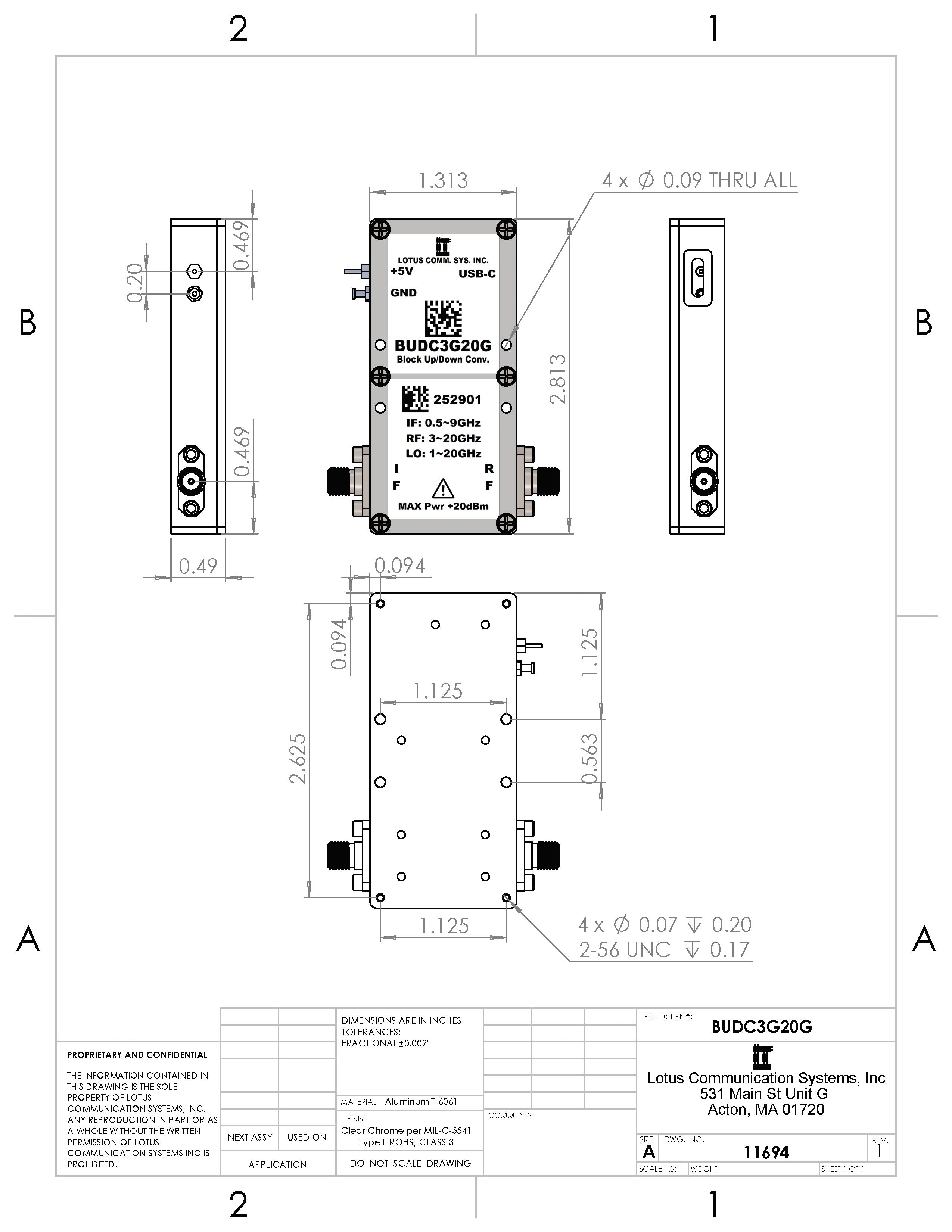 It has 12.0dB conversion loss at 17GHz with low LO‐RF leakage <30dBm. It can be powered either by USB‐C or +5~6V terminal with 235mA current draw. It has dimension of 2.8125”x1.3125”x0.48”.